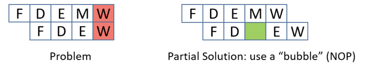 While pipelining improves instruction throughput by overlapping instruction stages, it can still suffer from hazards: a situation that prevents the next instruction in the pipeline from executing in its designated clock cycle. This causes the pipeline to stop or delay instruction advancement, which we call a pipeline stall. There are three particular hazards: data hazards, control hazards, and structural hazards. A data hazard is a hazard caused when an instruction depends on the result of a previous one that has not yet completed. A common solution involves inserting no operations (NOPs) (also called a pipeline bubbles) into the pipeline, notably the shorter instruction.