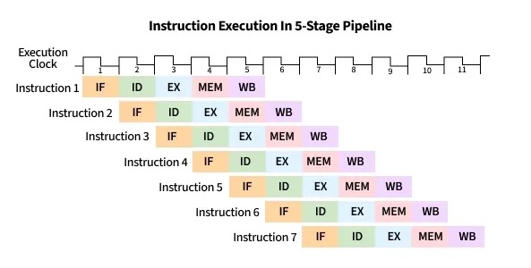 Finally, the first instruction enters in the write-back stage, and completes, where the second advances to the Memory stage, the third to Execute, and the fourth to Decode. At this point (i.e. after the fifth cycle), the pipeline is fully loaded, and so each stage of the CPU is busy with a different instruction, each one step behind the previous (which forms the staircase in the figure below). Once the pipeline is full, the CPU can complete one instruction every clock cycle, greatly improving instruction throughput. On the other hand, if each fetch-decode-execute cycle is performed sequentially, the instruction throughput would remain constant.